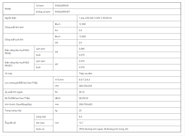 Dàn lạnh VRV Daikin FXDQ32PDVE là dàn lạnh giấu trần ống nối gió dạng mỏng 2 chiều loại tiêu chuẩn với công suất làm lạnh 12.300 BTU, công suất nóng 13.600 BTU. Máy mỏng (chỉ cao 200 mm) thích hợp lắp đặt cho các không gian trần hẹp khoảng 240 mm.